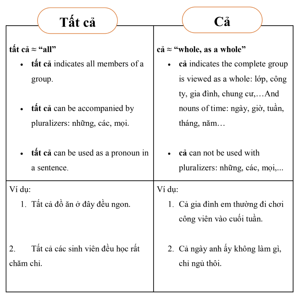 In Vietnamese, the words “cả” and “tất cả” are commonly used to express the concept of “all” or “whole.” These words play an important role in conveying the idea of inclusiveness and entirety. They are frequently used in various contexts, from everyday conversations to formal discussions. Let’s start to leaning how to use cả/tất cả in Viẹtnamese.