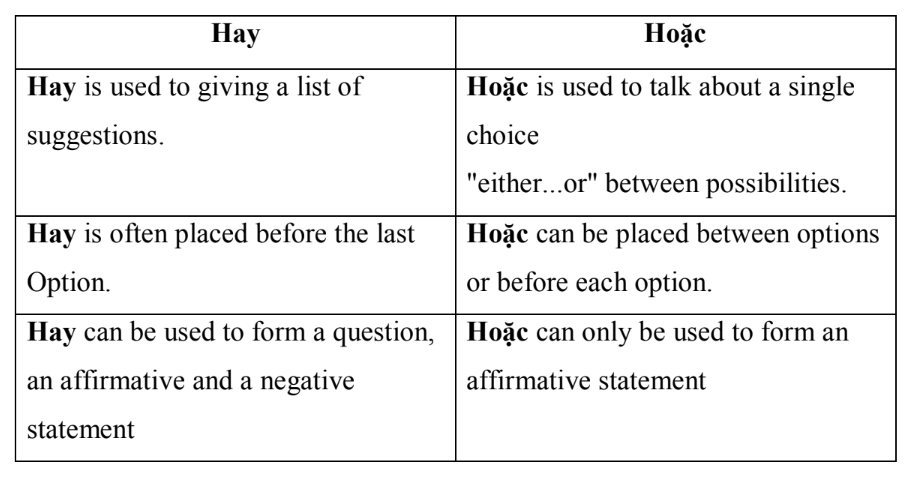 Here are the key differences between hay and hoặc in Vietnamese.