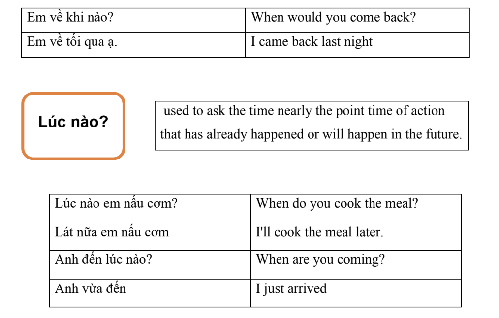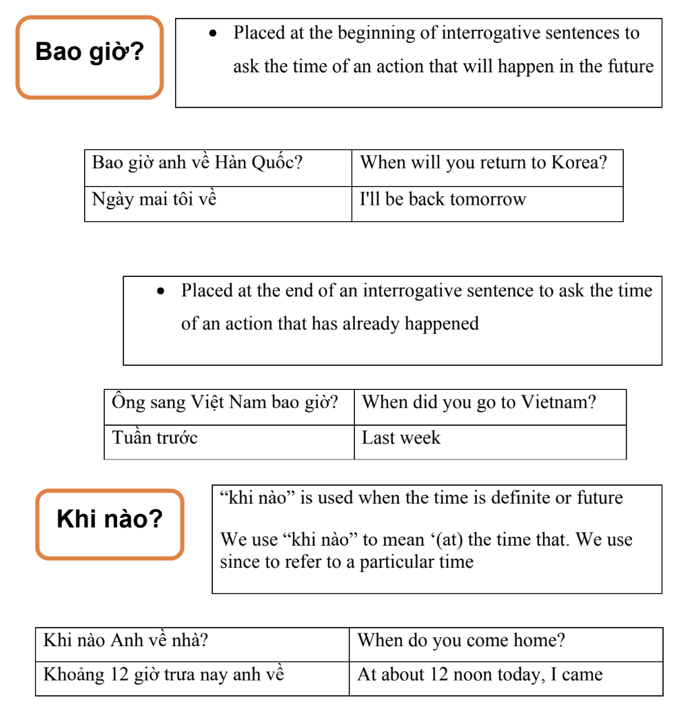 When learning Vietnamese, one of the essential skills is asking questions about time. The Vietnamese phrases “Bao giờ?” and “Khi nào?” both translate to “When?” in English, while “Lúc nào?” can be translated to “At what time?” or “What time?” These questions are commonly used in daily conversations, and mastering them can help non-native speakers communicate more effectively with Vietnamese speakers. Knowing how to use these question phrases can be particularly useful when making arrangements, scheduling appointments, or planning events. By practicing these phrases, learners can improve their conversational skills and become more confident when communicating with native Vietnamese speakers. Now let’s start!
