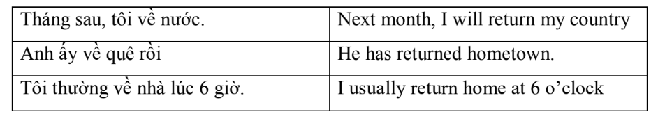 Ex: về quê (return to one’s native village), về nhà (return home), về nước (return to one’s native country)